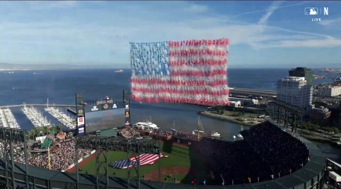 “You might have heard there was an audible gasp from this huge crowd when a group of drones hovering above McCovey Cove right before the end of the anthem they each shot out a puff, a cloud of colored smoke that put together looked like a giant sort of magical American flag floating in the sky above McCovey Cove and that was pretty spectacular,” Dave said. “The cloud of all that smoke is now moving out over San Francisco Bay.”